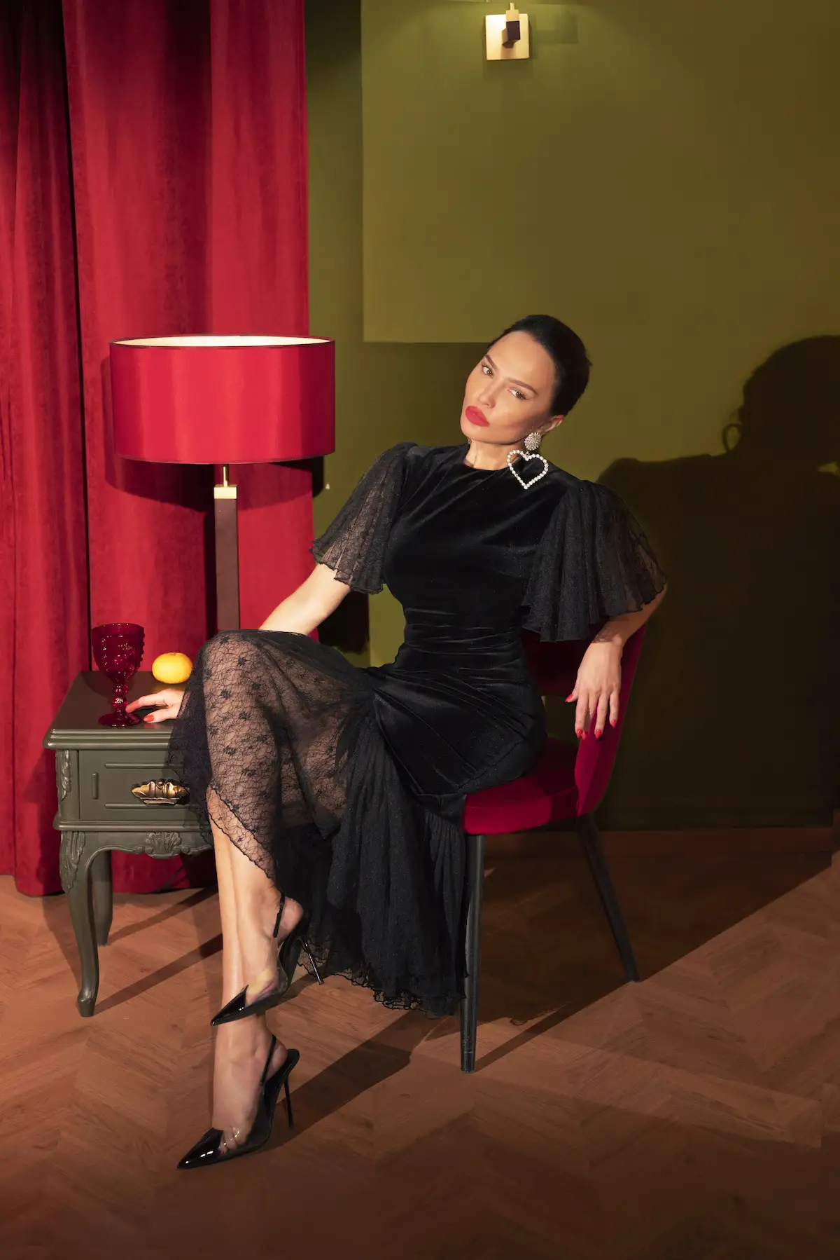 Velvet silhouette dress with wing sleeves and guipure frill