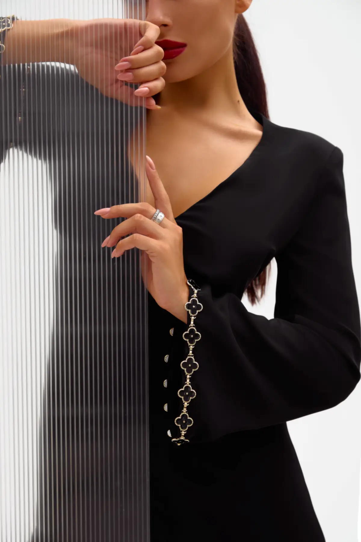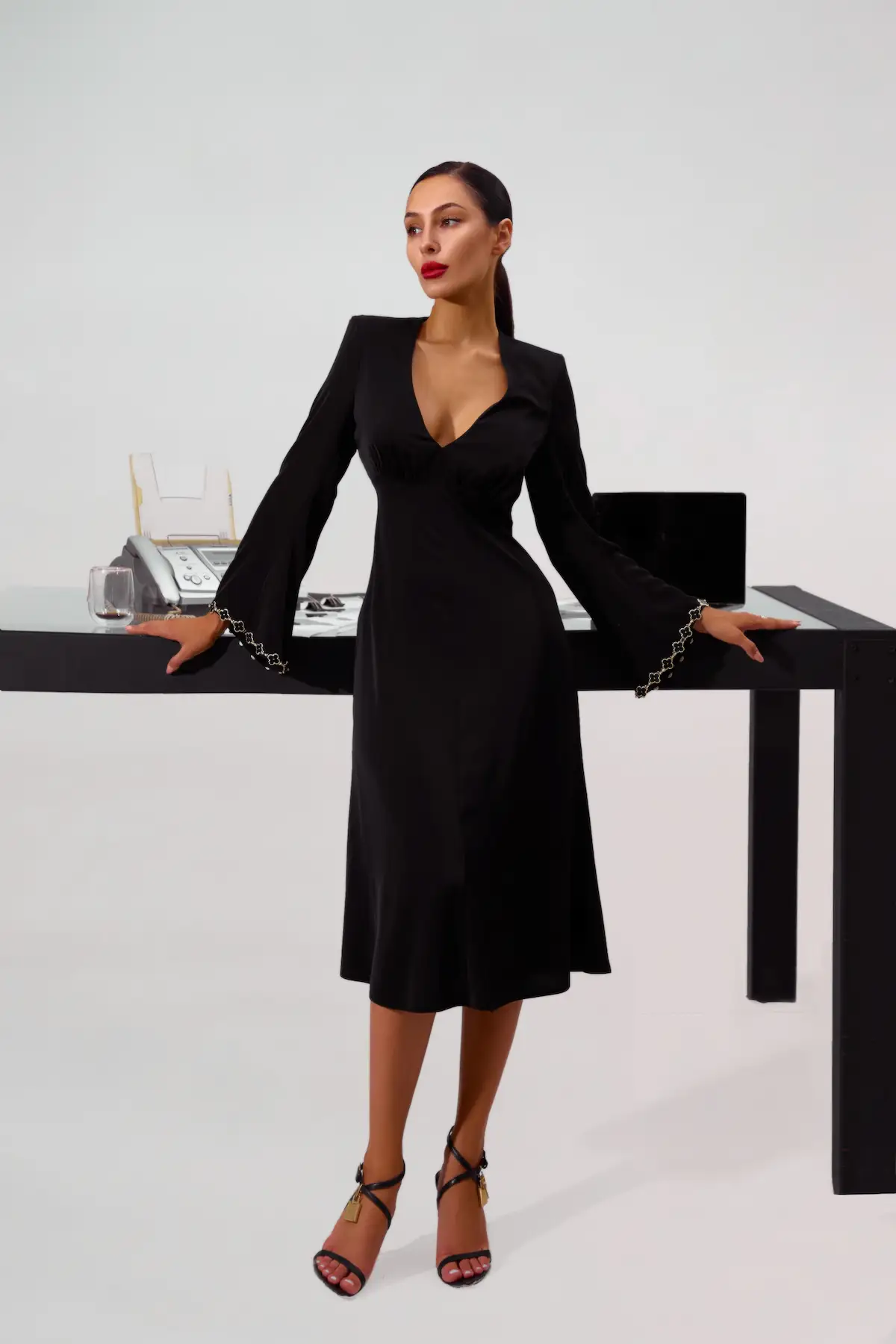 Black silhouette dress with a skirt – gode and trim with metal inserts on the sleeves
