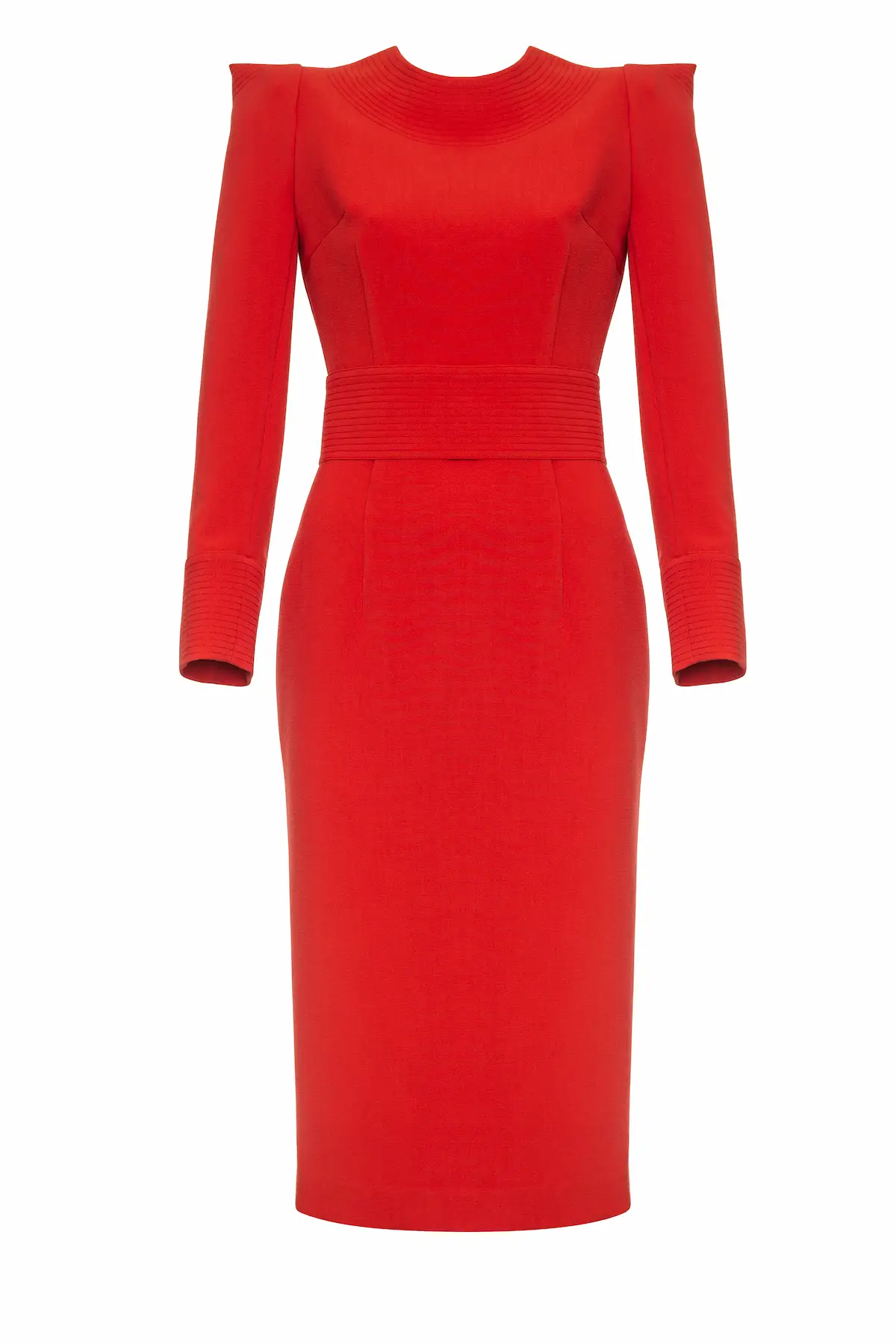 Сукня теракотового кольору з рельєфними плечима та стьобаним поясом на ґудзиках