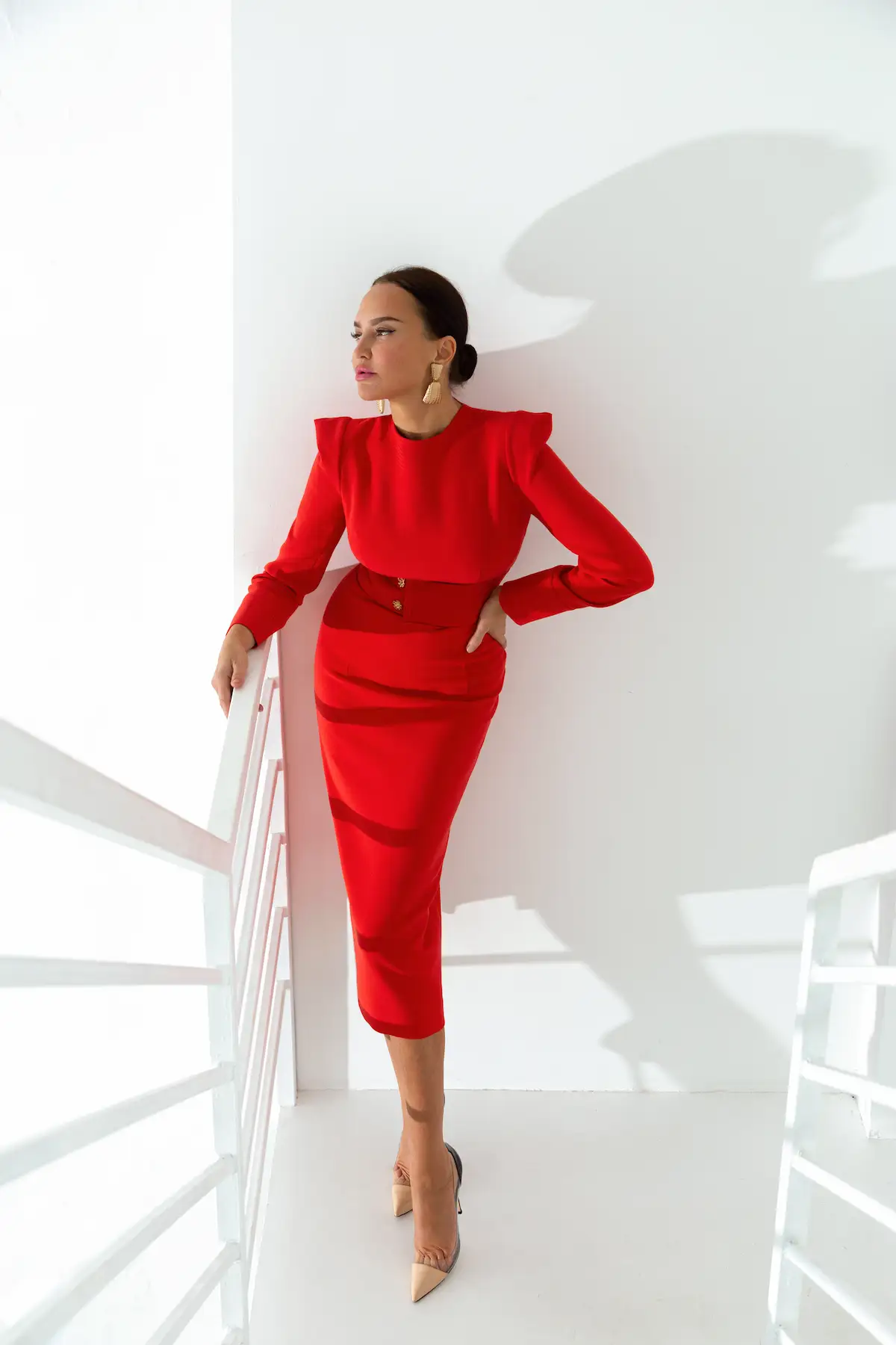 Сукня теракотового кольору з рельєфними плечима та стьобаним поясом на ґудзиках – Жіночий одяг BLIND – Інтернет-магазин українського бренду