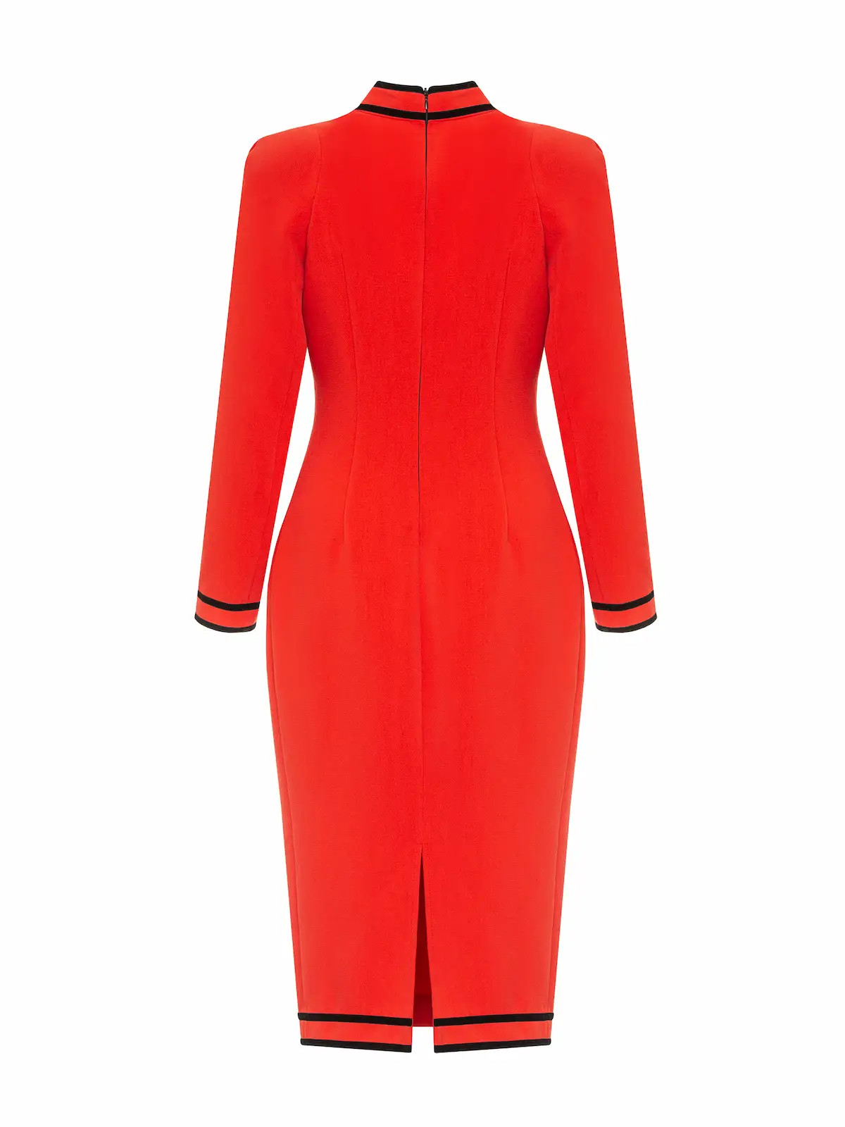 Платье-футляр цвета терракот с контрастной отделкой из черного бархата